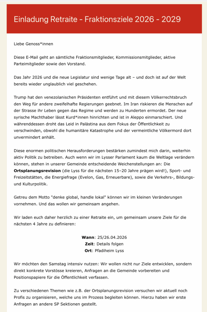 Die geplante Retraite am Wochenende vom 25. und 26. April 2026 soll über diese Legislaturziele abschliessende Klarheit bringen.